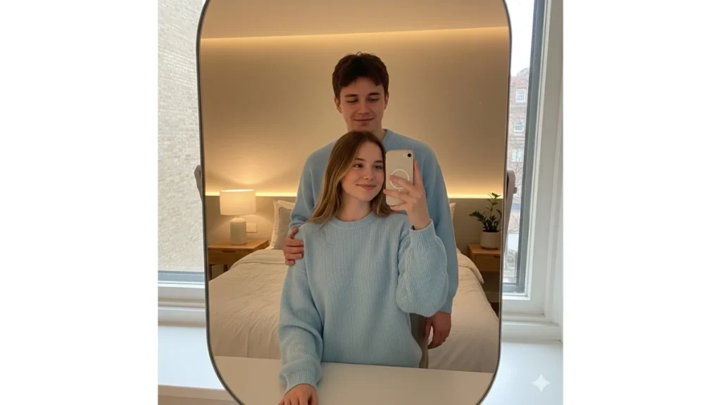 Tren mirror selfie couple portrait sedang viral di 2025, terutama di kalangan pasangan muda yang ingin memamerkan kebersamaan mereka dengan sentuhan artistik khas AI. Gaya foto ini banyak digunakan di Instagram, TikTok, dan Pinterest karena mampu menampilkan chemistry pasangan dengan pencahayaan lembut, warna pastel, serta detail refleksi cermin yang realistis dan dramatis.