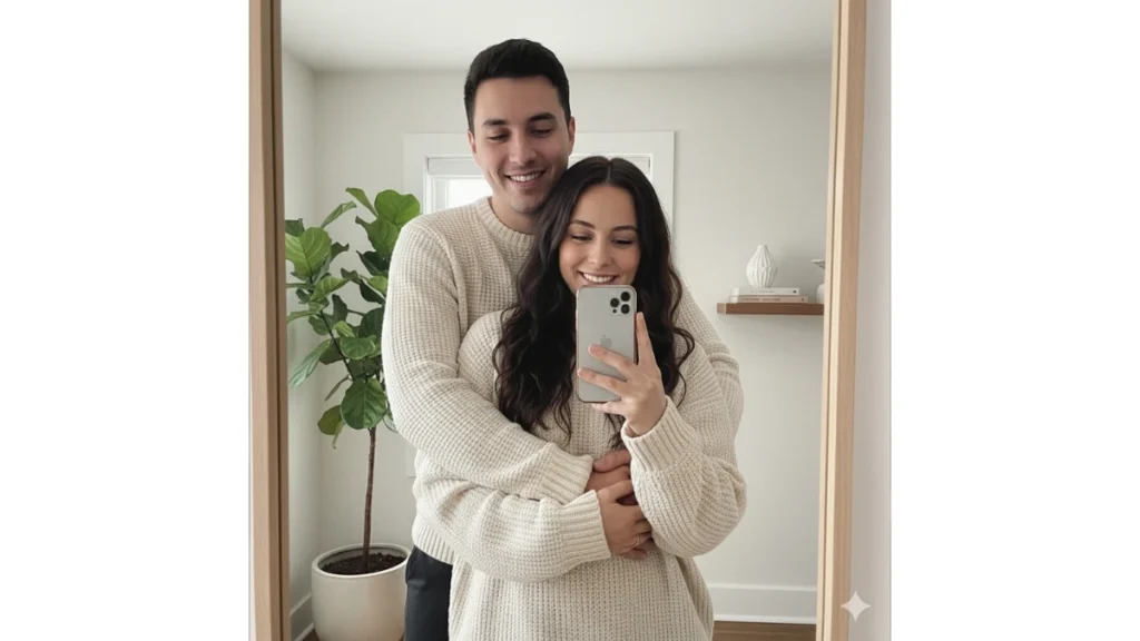 “Mirror selfie pasangan yang mengenakan sweater rajut krem senada. Pria berdiri di belakang memeluk wanita dari pinggang, keduanya tersenyum lembut ke arah cermin. Latar belakang minimalis dengan tanaman hias dan rak sederhana menambah suasana cozy dan natural.”