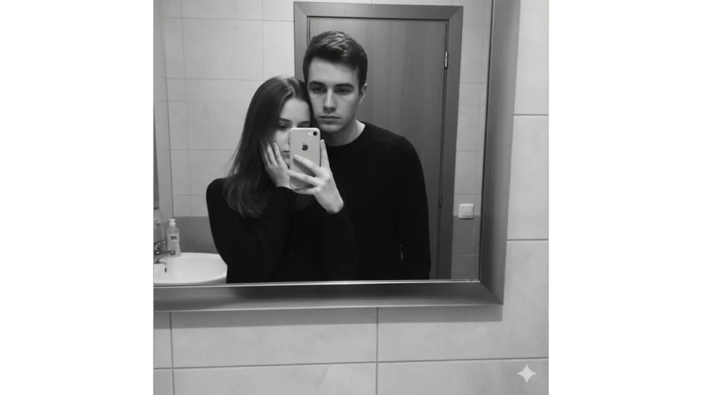 “Mirror selfie hitam-putih pasangan muda. Wanita memegang ponsel sebagian menutupi wajah, sementara tangannya yang lain menyentuh pipi pria. Pria menatap kamera dengan ekspresi serius. Nuansa dramatis, elegan, dan minimalis.”