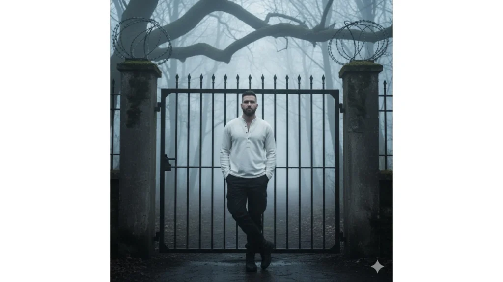 Pria berdiri di depan gerbang besi tua dikelilingi hutan berkabut, memakai kemeja panjang krem dan celana kargo hitam.
