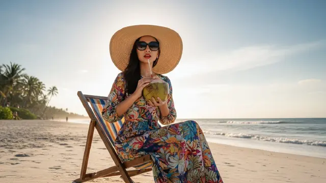 “Portrait di pantai dengan topi lebar dan kacamata hitam, duduk di beach chair, minum kelapa, bayangan panjang sore hari, gaya fashion photography.”