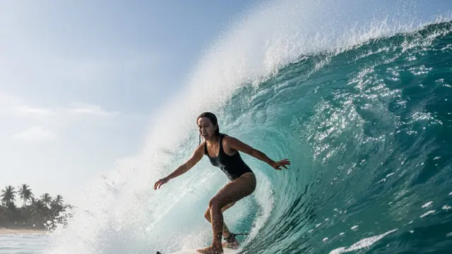 “Action shot seseorang sedang surfing, ombak tinggi, percikan air, ekspresi semangat, sudut kamera rendah, shutter speed cepat membekukan gerakan.”
