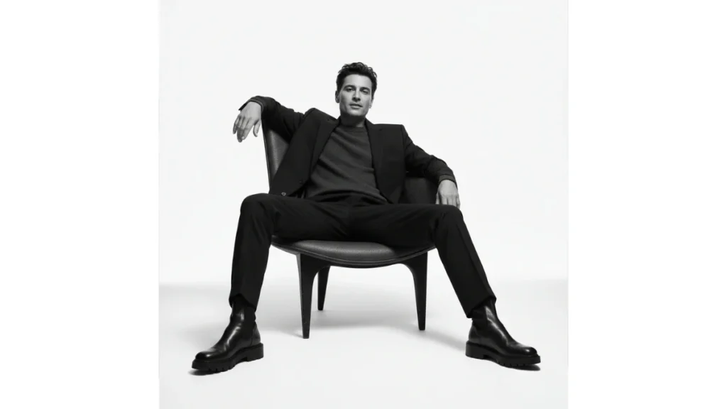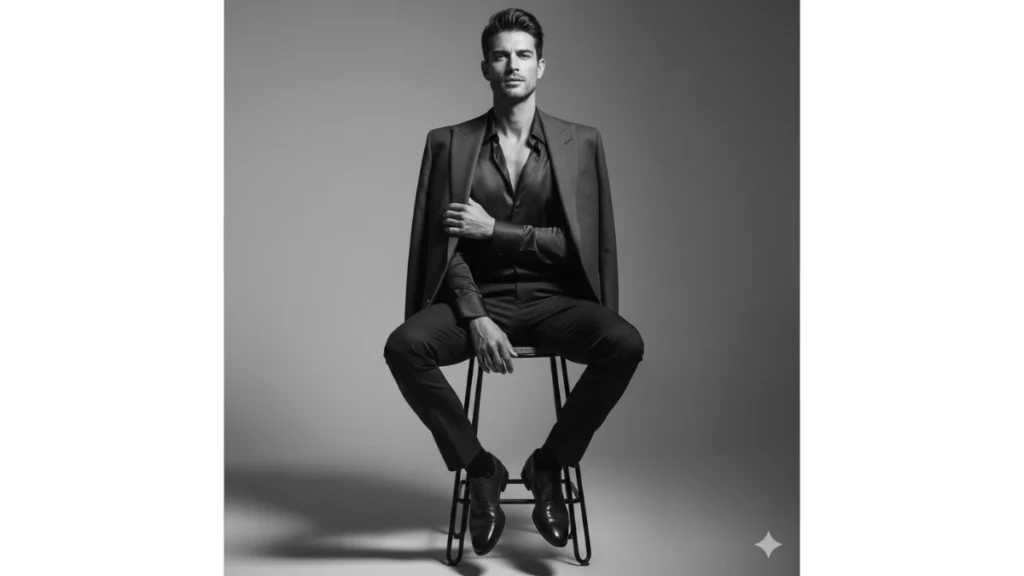 Pose santai di kursi dengan setelan jas gelap, kemeja rajut, dan sepatu kulit elegan. Wajah tenang tapi memancarkan aura karisma. Cahaya putih studio dan tone hitam-putih menambah kesan eksklusif.