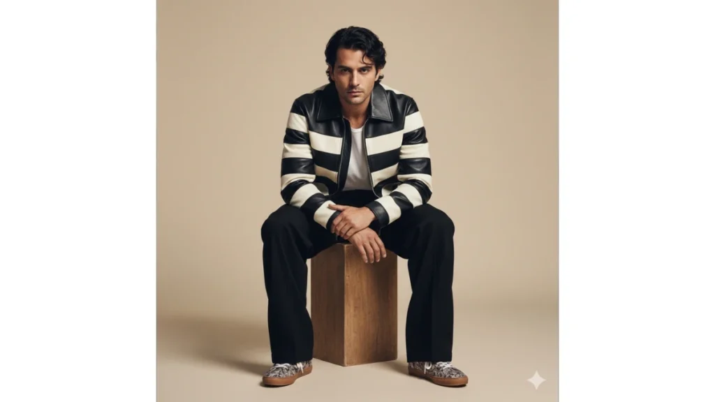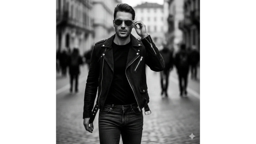Bayangkan sedang berjalan di jalanan kota klasik Eropa, mengenakan jaket suede hitam, jeans ramping, dan kacamata aviator. Satu tangan mengangkat kacamata dengan ekspresi cool.