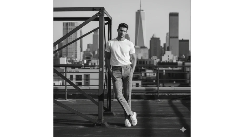 Kamu berdiri santai di atap gedung New York dengan t-shirt putih dan celana motif kotak-kotak. Cahaya matahari sore menciptakan bayangan tegas di sekelilingmu.