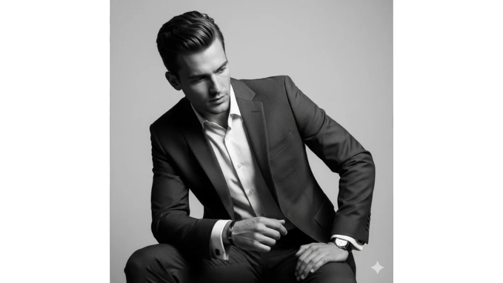 Hasil: Foto monokrom yang menggambarkan aura pria elegan dan tenang bergaya GQ Italia aesthetic.