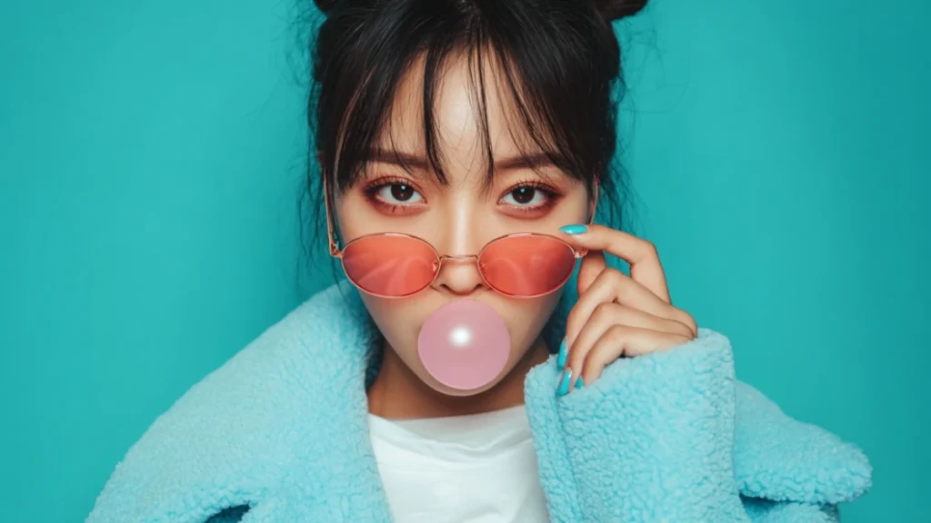 “Young Korean woman close-up at eye level, bold turquoise background, bubblegum bubble, rose-tinted sunglasses, vibrant blue nails, pop-art style, 4K quality –ar 16:9 –v 7.0.”