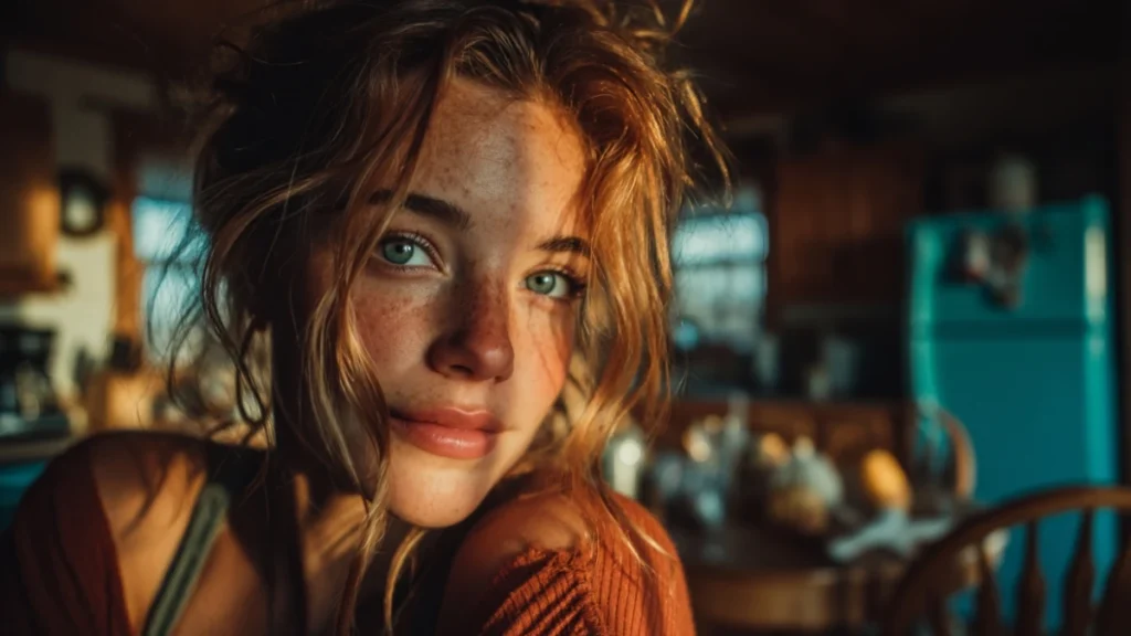 “A young woman sits at a wooden kitchen table, morning sunlight cutting through blinds, orange warmth across her face, blue refrigerator glow behind –ar 16:9 –v 7.0 –quality 2 –stylize 1000.”