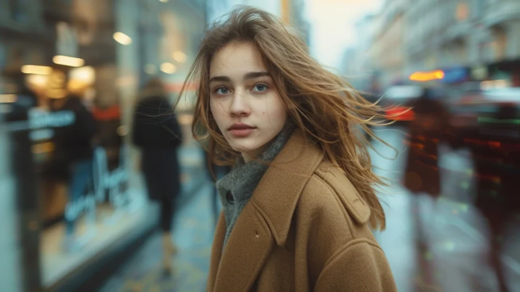 “Cinematic Street Photography, stylish young woman in motion, blurred pedestrians, shallow depth of field, soft pastel tones, candid fashion moment –ar 16:9 –raw –v 6.0.”