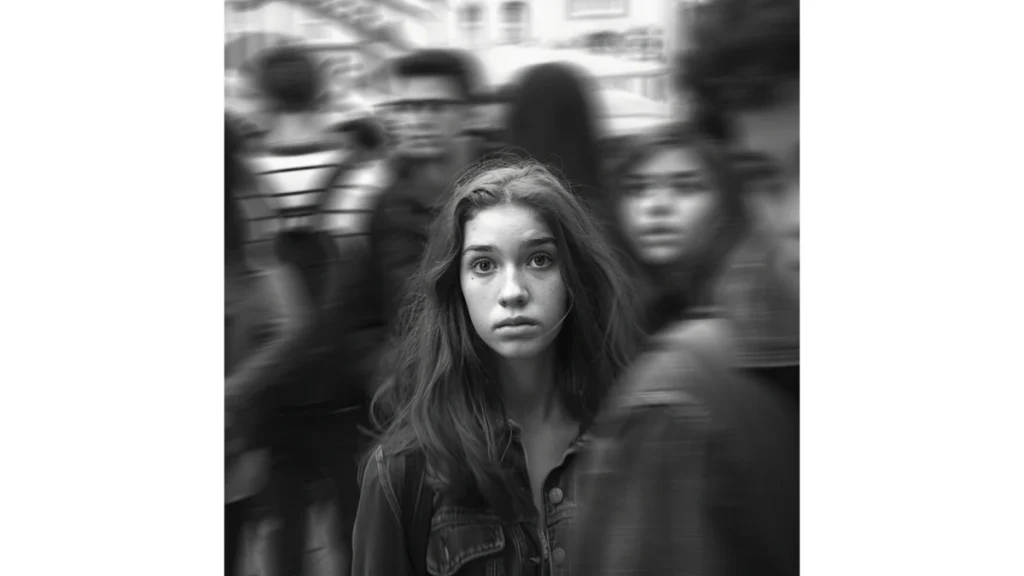 “Tired, beautiful teenage woman standing in urban crowd, motion blur, gray tones, feeling lost –ar 16:9 –v 6.0.”