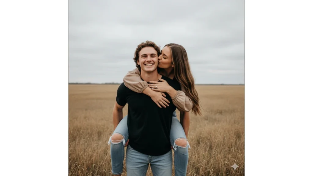 “A joyful outdoor shot of a young couple, man giving piggyback ride, smiling, woman kissing his cheek, wearing casual outfits in a field. Keep faces unchanged.”