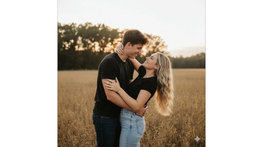 “A romantic outdoor portrait of a young couple, embracing in a field, woman leaning back playfully, natural light. Keep faces unchanged.”
