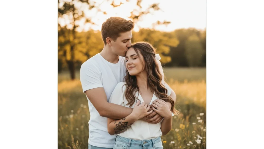 “A romantic outdoor portrait of a young couple, man hugging woman from behind, kissing her forehead, warm golden light background. Keep faces unchanged.”