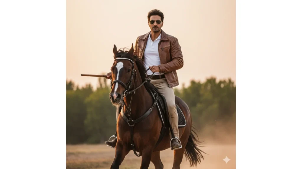 Potret sinematik pria berkuda di bawah langit senja. Mengenakan jaket kulit cokelat dan kacamata hitam, dengan latar belakang hutan terbuka. Hasilkan nuansa petualangan dan gaya maskulin dengan pencahayaan hangat.