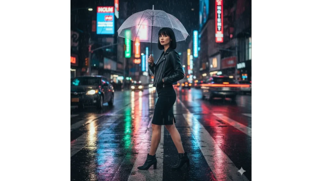 Wanita elegan berjalan di jalan kota yang basah di malam hari dengan payung transparan. Refleksi lampu neon di trotoar menambah kesan dramatis dan urban modern. Cocok untuk konten fashion atau city night aesthetic.
