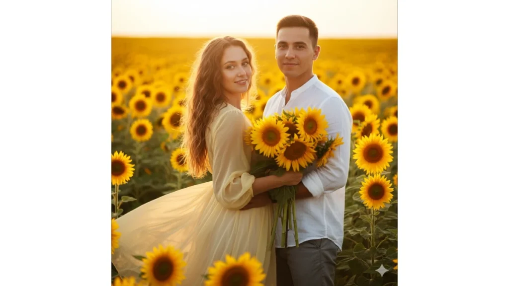 Pasangan pria dan wanita berdiri di ladang bunga matahari saat sore hari. Warna pastel lembut dengan efek golden light menciptakan suasana romantis, cocok untuk konten lifestyle atau prewedding bergaya modern.