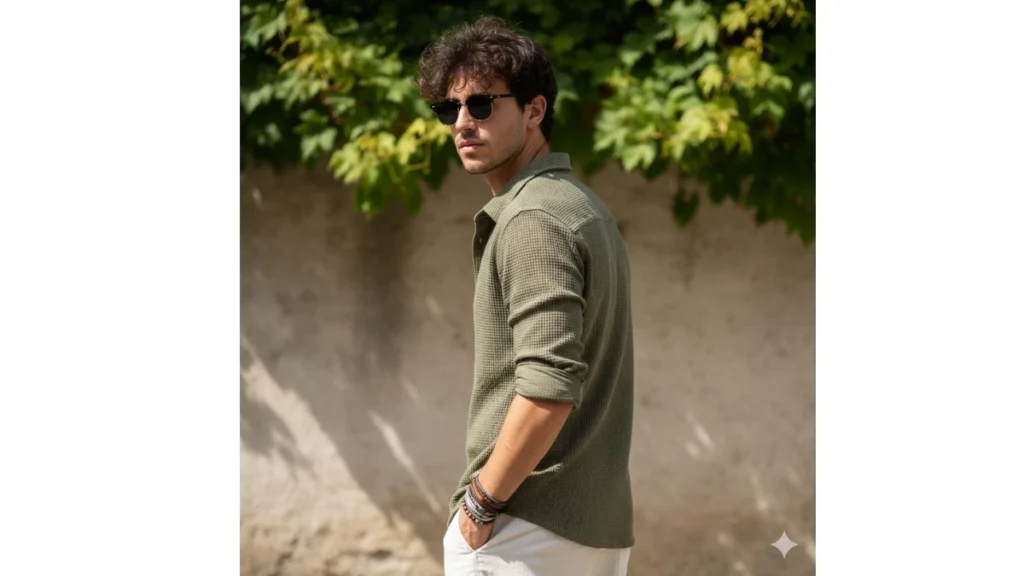 “Pria muda berambut ikal gelap mengenakan kemeja hijau zaitun berlengan digulung, celana terang, dan gelang di pergelangan tangan kiri. Berdiri santai di luar ruangan dengan latar dedaunan hijau dan dinding terang. Fokus pada ekspresi percaya diri dan pencahayaan alami yang lembut.”