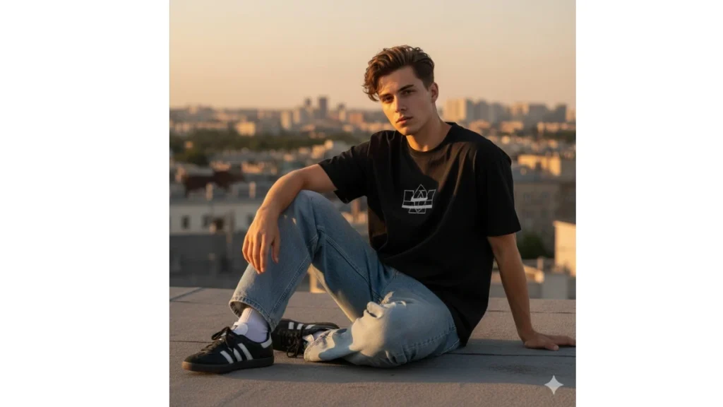“Potret 4K ultra-realistik pria 20 tahun di atap kota saat senja, mengenakan jeans longgar biru muda, kaus hitam oversized, dan sepatu Adidas. Pencahayaan golden hour dengan efek sinematik ‘f/1.8 aperture’ dan depth of field dramatis seperti foto majalah.”