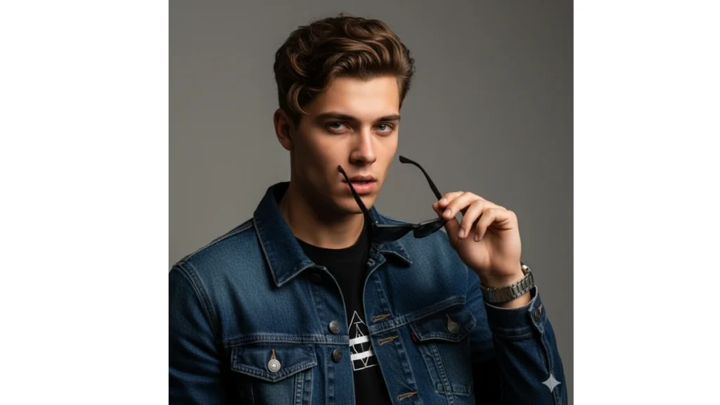 “Potret editorial bergaya majalah pria berambut tebal, mengenakan jaket jeans biru tua dan jam tangan mewah. Memegang kacamata di bibir sambil menatap samping dengan ekspresi karismatik. Warna dan pencahayaan sinematik dengan efek studio 8K.”