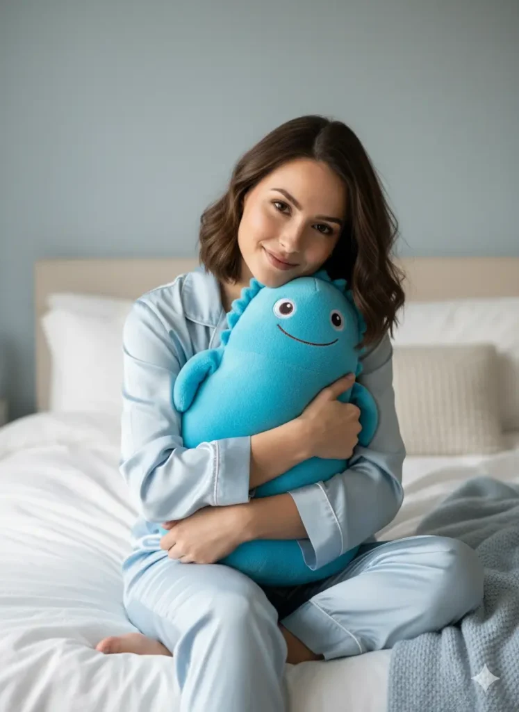 Potret wanita muda duduk di tempat tidur dengan piyama satin biru muda, memeluk boneka biru lucu. Nuansa kamar lembut dengan cahaya natural menciptakan kesan hangat dan nyaman.
