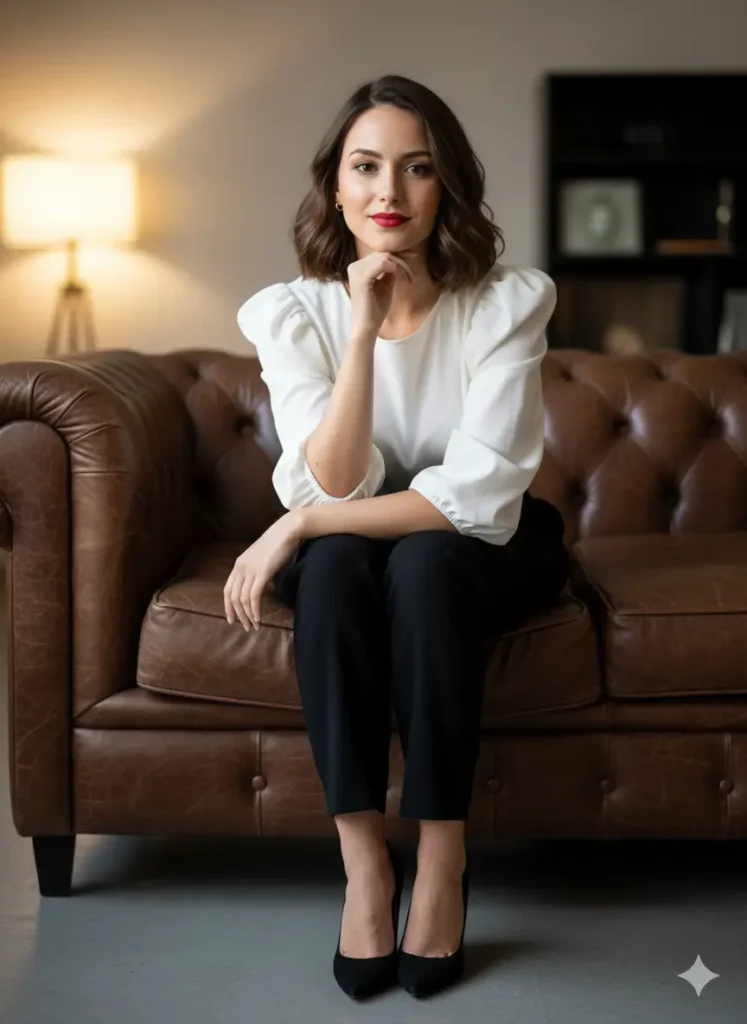 Potret wanita percaya diri di sofa kulit cokelat, mengenakan blus putih dan celana hitam. Pencahayaan lembut dan pose elegan mencerminkan karakter kuat dan profesional.