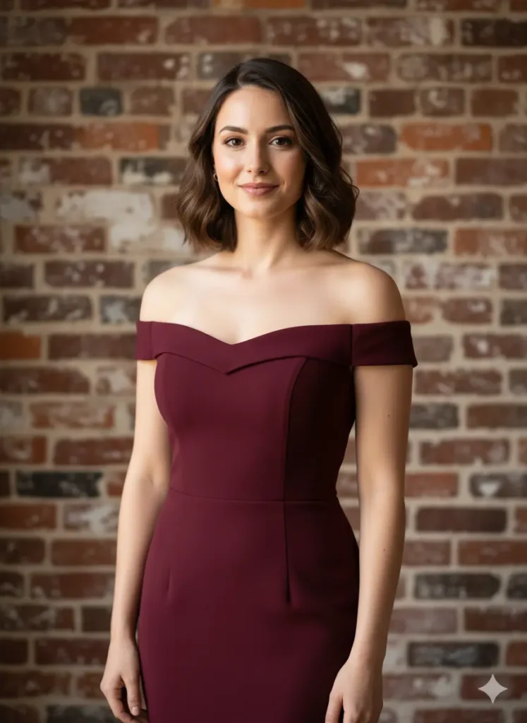 Potret editorial wanita bergaun merah marun berdiri di depan dinding bata ekspos. Cahaya lembut memunculkan kesan fashion editorial yang menawan.