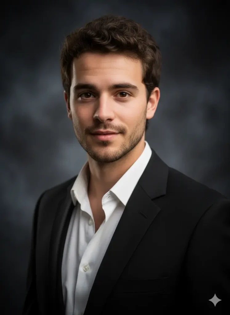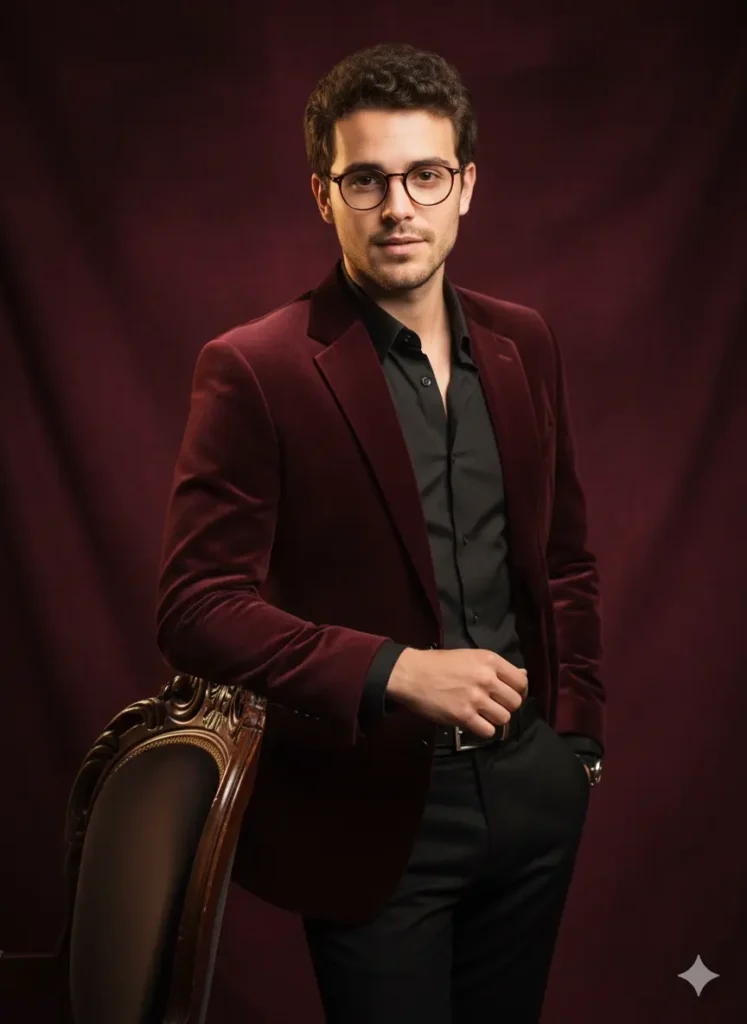 Potret pria mengenakan jas hitam dengan latar gelap berasap, pencahayaan dramatis menyorot wajahnya. Hasilnya mirip pemotretan majalah dengan tone maskulin.