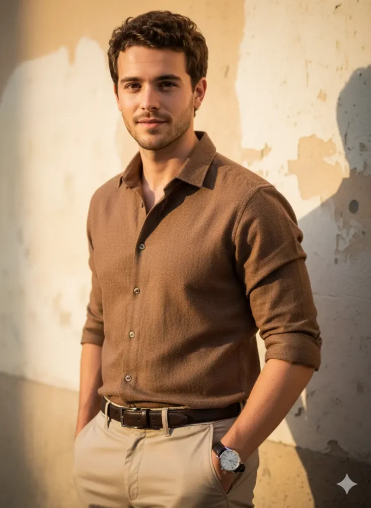 Potret pria berpose di dinding yang terkena sinar matahari sore. Warna hangat dan bayangan lembut menciptakan suasana golden hour yang mempesona.