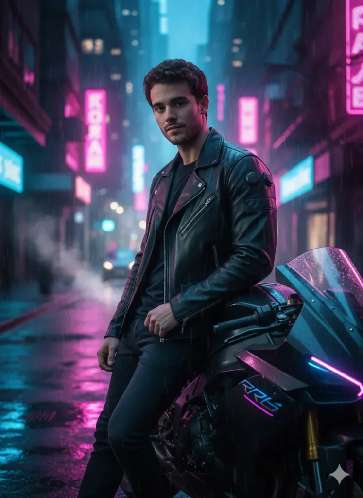 Potret pria bersandar di motor di tengah kota neon biru dan pink. Refleksi cahaya di jalan basah menciptakan atmosfer cyberpunk futuristic khas film Blade Runner.