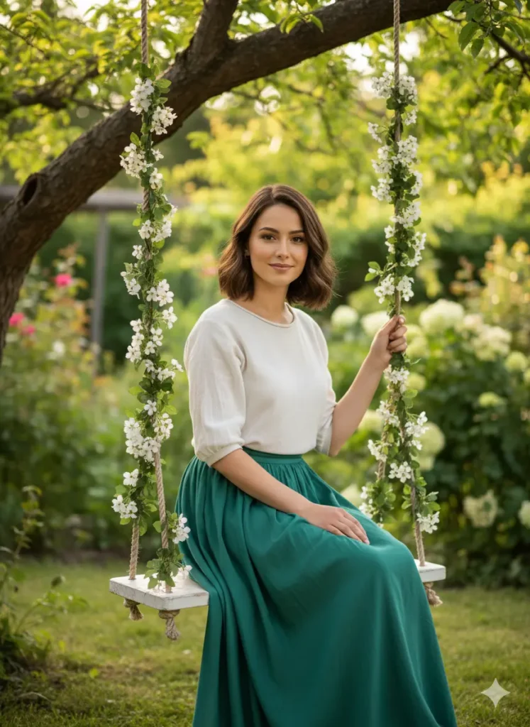 Potret wanita di ayunan taman, mengenakan blus putih dan rok hijau panjang. Dihiasi bunga putih dan cahaya matahari lembut, hasilnya terasa alami dan elegan.