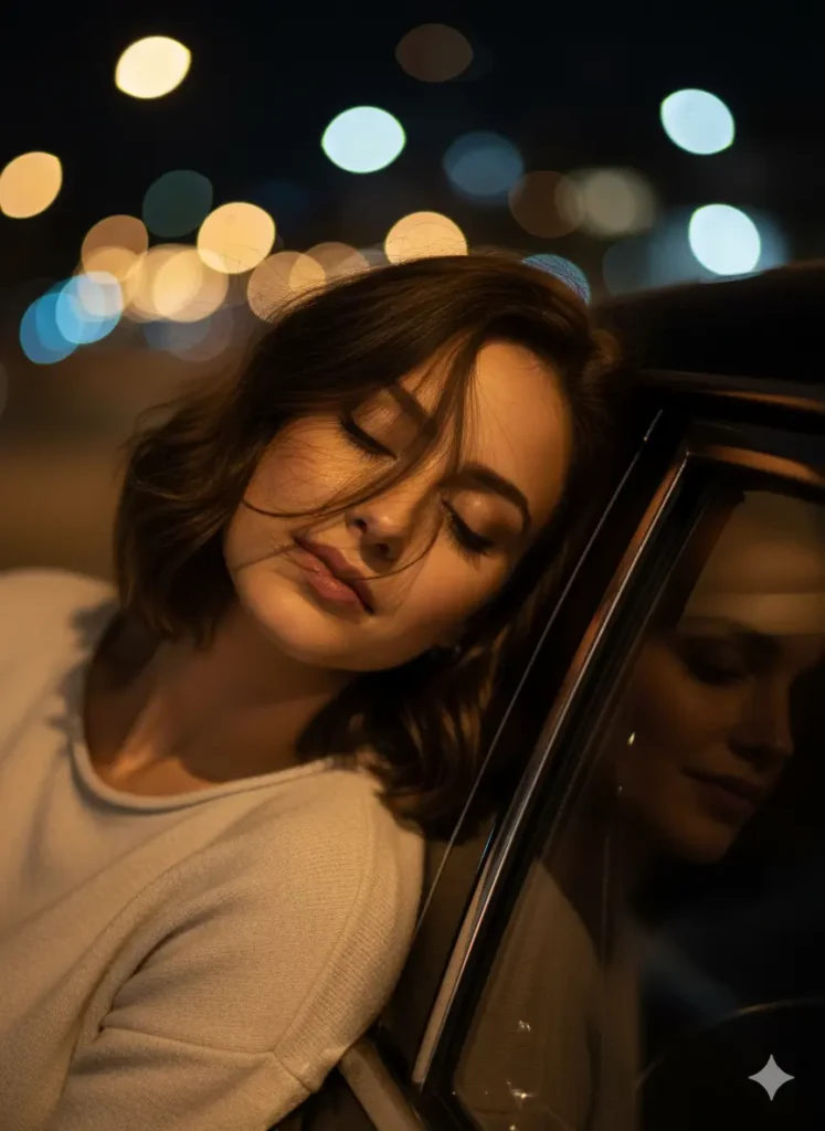 Potret malam sinematik wanita bersandar di mobil, rambut tertiup angin, mata terpejam menikmati momen tenang. Latar bokeh lampu jalan memberi kesan dramatis.