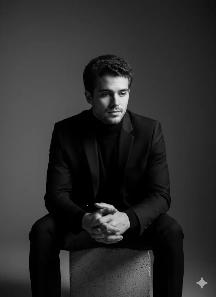 Potret hitam-putih pria memakai setelan jas hitam, duduk dengan ekspresi introspektif. Kontras cahaya tajam menciptakan nuansa elegan dan klasik.