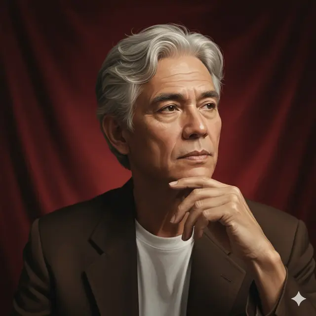 “Buat prediksi wajah lansia dari foto ini dengan pose tangan menyentuh dagu, ekspresi reflektif dan tenang, tatapan ke samping kanan atas. Latar belakang studio foto klasik dengan kain beludru merah gelap, pencahayaan spotlight lembut memberikan kesan potret lukisan tradisional.”