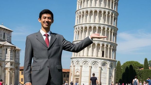 “Foto wide-angle seluruh badan dari seorang pria muda mengenakan jas abu-abu dan dasi merah, berdiri di rerumputan hijau di depan Menara Pisa saat cuaca cerah. Ia menatap kamera sambil tersenyum, dengan sinar matahari cerah menciptakan detail tajam dan kontras lembut.”