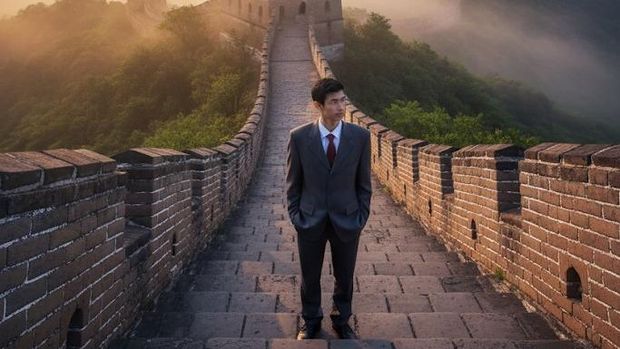 “Sebuah foto seluruh badan wide-angle super realistis dari seorang pria muda mengenakan jas abu-abu dan dasi merah, berdiri di Tembok Besar China saat matahari terbit di pagi berkabut. Ia melihat ke kejauhan dengan ekspresi kagum. Lanskap pegunungan diselimuti kabut lembut dengan sinar matahari yang menembus di antara awan.”