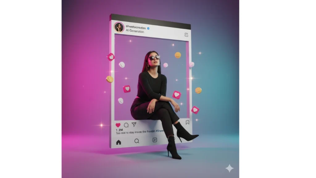 Deskripsi Prompt: Potret realistis seorang wanita muda bergaya trendi di dalam frame Instagram berukuran besar. Ia mengenakan kacamata hitam, gaun modis, dan sepatu berkilau, duduk santai di dalam frame dengan satu kaki seolah keluar menembus bingkai—memberikan efek 3D dramatis. Latar belakang berupa gradasi neon berwarna pink, ungu, dan turquoise yang menyala lembut, ditambah ikon media sosial melayang di sekitarnya.