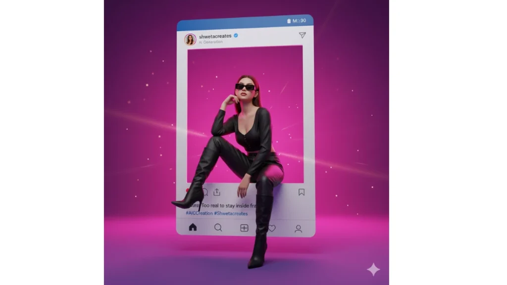 Deskripsi Prompt: Seorang wanita mengenakan gaun hitam elegan dengan kacamata stylish berdiri di dalam frame Instagram raksasa. Satu kakinya tampak melangkah keluar dari frame menciptakan ilusi kedalaman. Latar belakang neon pink dan ungu menciptakan efek viral dan menarik perhatian.