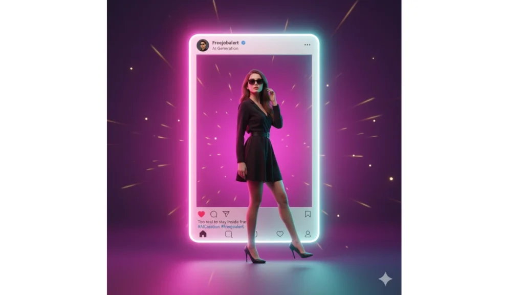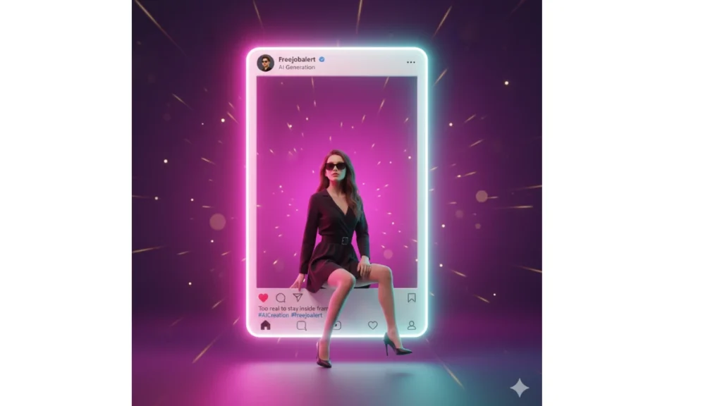 Deskripsi Prompt: Potret cewek muda bergaya chic dalam balutan busana hitam dan kacamata. Ia berpose santai di dalam frame Instagram, dengan efek satu kaki keluar dari bingkai. Latar belakang bercahaya neon ungu-pink disertai efek bokeh lembut dan kilauan partikel.