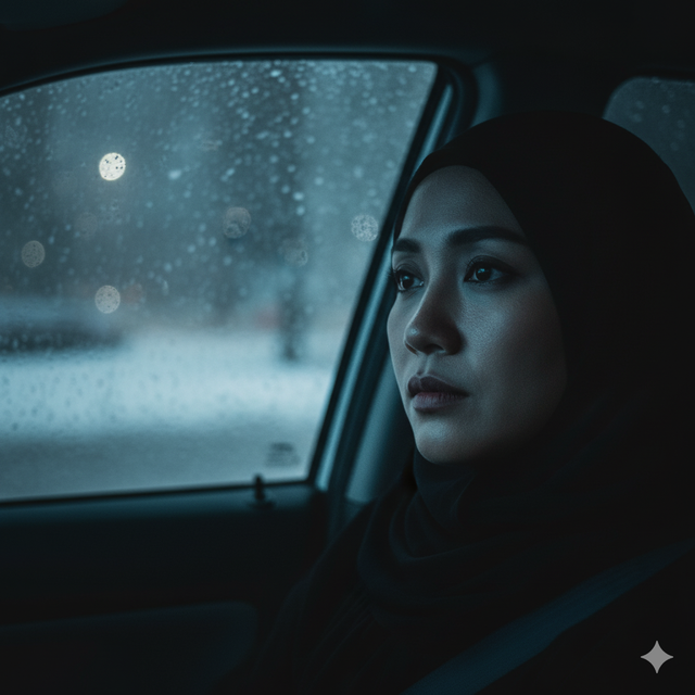 Potret close-up seorang wanita Indonesia di dalam mobil pada malam bersalju. Jendela mobil berembun, salju tampak blur di luar. Cahaya biru dari dashboard menerangi wajahnya yang merenung. Shallow depth of field, tone gelap dan moody, cinematic portrait. –ar 4:5