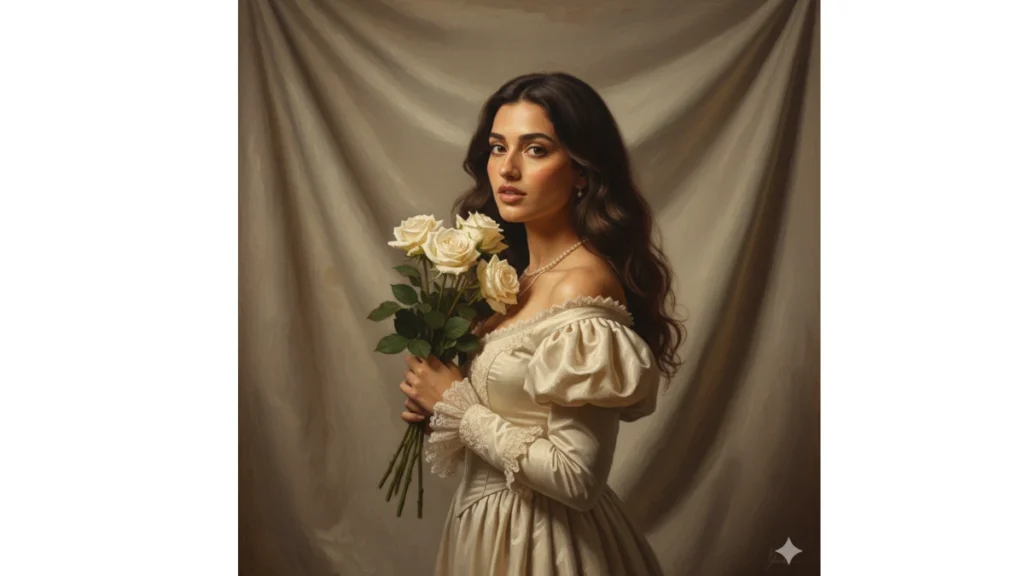Prompt: “Studio portrait in Renaissance style, with soft golden light from above creating gentle shadows. Subject faces slightly to the side, holding a small bouquet of white roses. She wears a cream Regency dress with lace cuffs and a pearl necklace.”