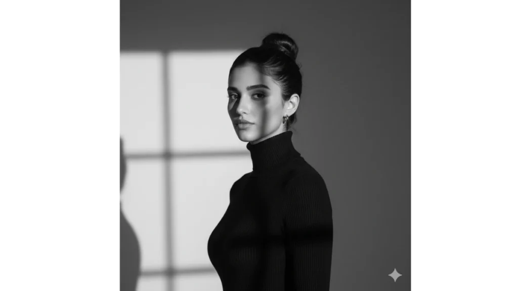 Prompt: “A high-resolution black and white portrait of a girl wearing a sharp black turtleneck and gold earrings, Korean bun hairstyle, strong light beams cutting through shadows, calm and introspective expression.”