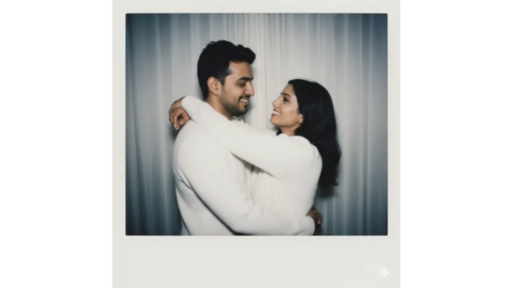 Prompt: “Take a picture with a Polaroid camera. The photo should have slight blur from flash in a dark room, no props, white curtain background, guy hugging girl in matching outfits.”