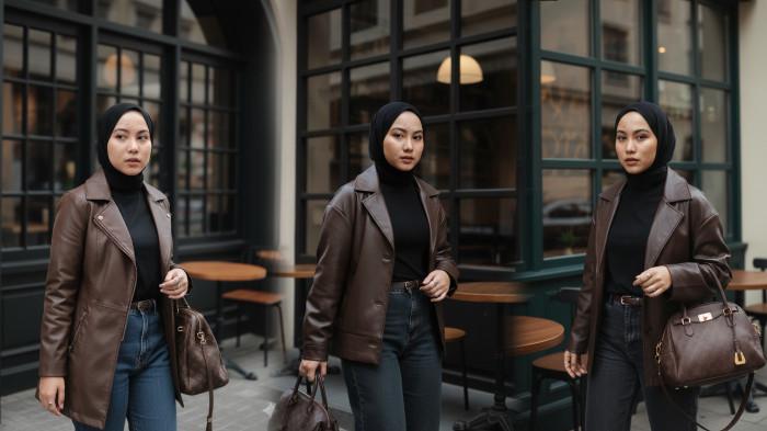 Ingin hasil bergaya majalah musim dingin Eropa? Prompt ini menonjolkan layering earth tone: turtleneck beige, mantel cokelat taupe, dan hijab pashmina rajut.