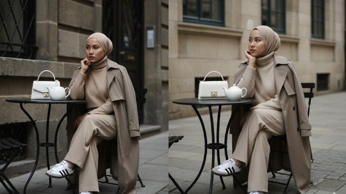 Paduan hijab beige, cardigan rajut, dan sneakers retro menjadikannya gaya modern yang tetap berpijak pada estetika klasik old money. Hasilnya cocok untuk konten lifestyle premium atau portofolio pribadi.