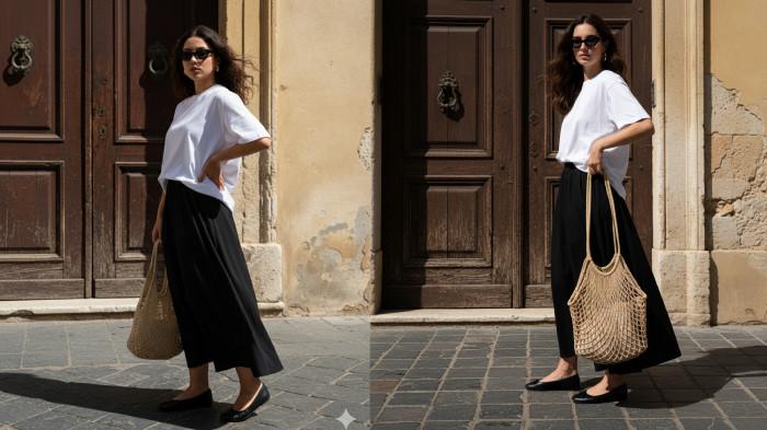 Prompt terakhir menghadirkan kontras antara busana modern minimalis dan arsitektur kuno Eropa. Gaun hitam panjang dan pintu kayu besar menciptakan kesan misterius dan aristokratik.