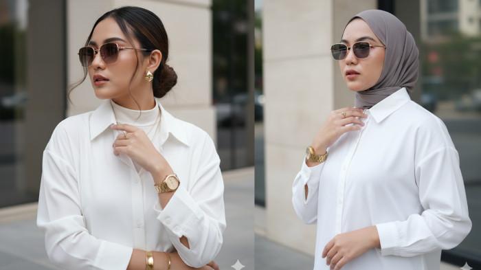 Buat potret fesyen outdoor dengan cahaya alami menyebar. Latar dinding netral dan pantulan kaca. Lensa setara 35–50 mm. Pose miring elegan, satu tangan dekat leher untuk menonjolkan aksesori. Busana kemeja putih oversize dan hijab abu-abu. Aksesori kacamata hitam modern, jam dan gelang emas, serta cincin tipis. Riasan matte beludru, eyeliner halus, bibir nude kemerahan.