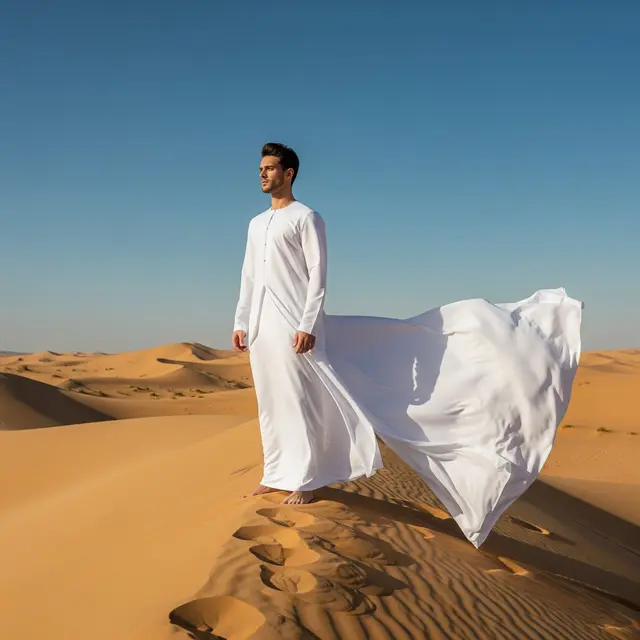 “Model pria mengenakan thobe putih modern berdiri di atas bukit pasir, langit biru cerah, kain berkibar dramatis, pencahayaan editorial fashion, nuansa eksotis dan elegan.”