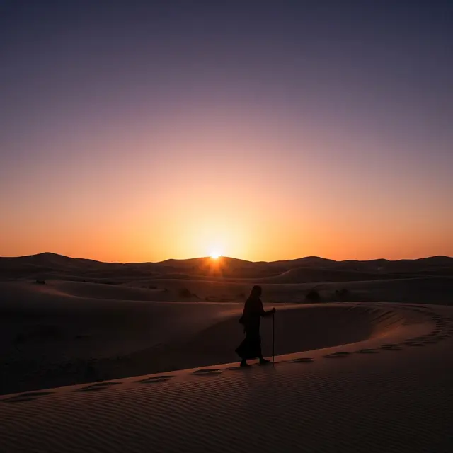 “Langit biru keunguan saat fajar, siluet pejalan kaki membawa tongkat melintasi bukit pasir, pencahayaan lembut, atmosfer tenang dan reflektif.”