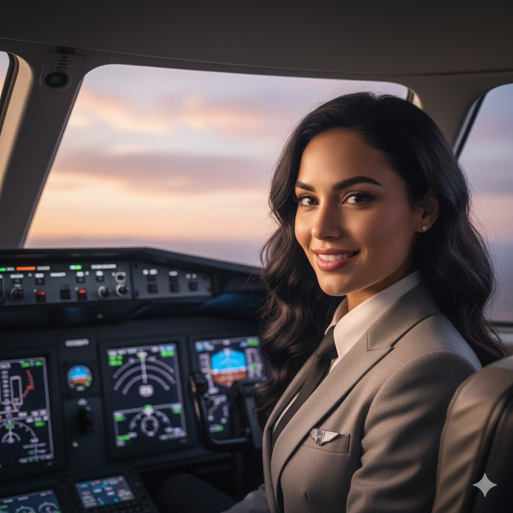 “Wanita pilot muda di kokpit pesawat pribadi, ekspresi ceria. Seragam navy, headset silver, langit cerah di luar jendela depan. Tone daylight hangat, detail halus.”