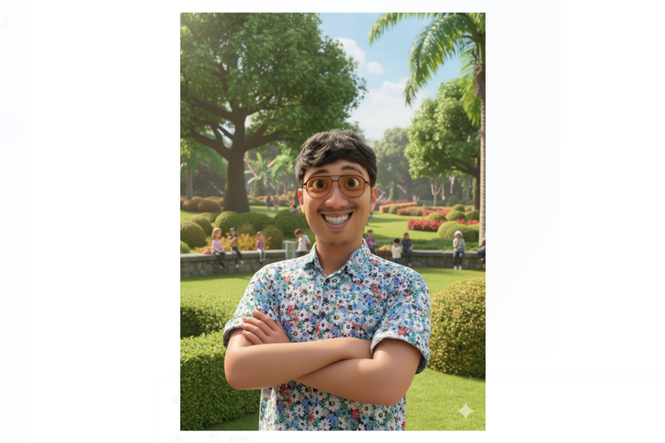 “Ubah foto ini menjadi karakter animasi 3D bergaya Pixar dengan wajah asli tetap sama, memakai pakaian kasual modern, dan latar taman kota penuh warna.”